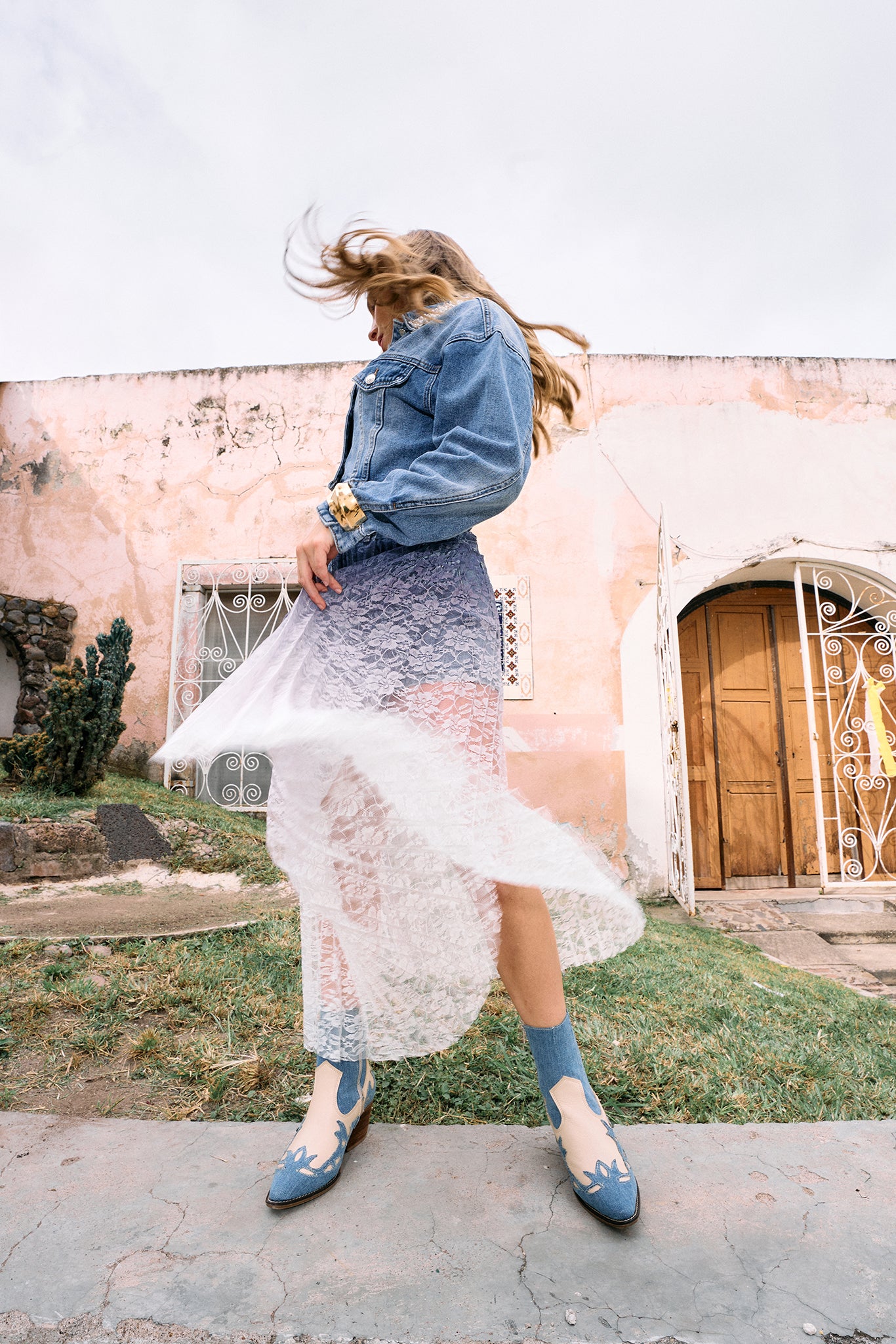 - Falda con short de mezclilla oculto y encaje hasta el tobillo